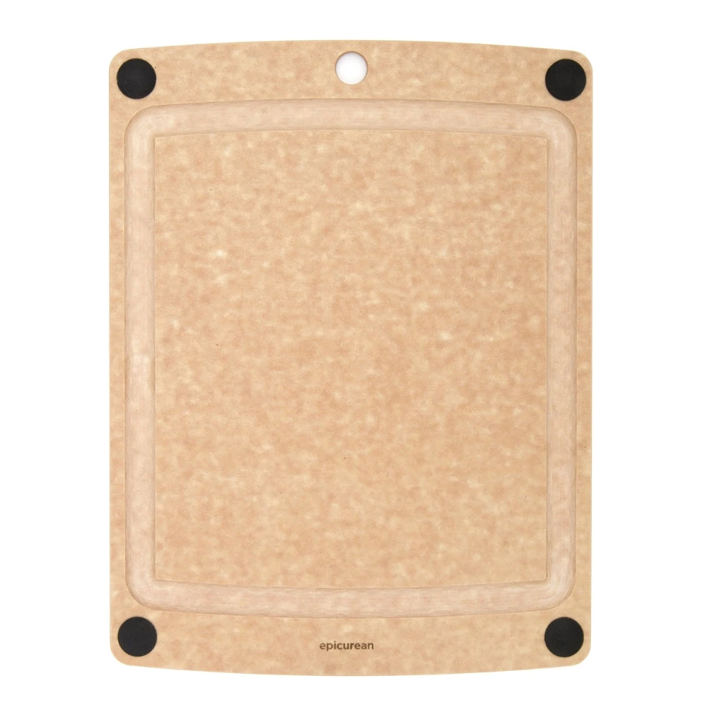 The Epicurean 14.5-inch by 11.25-inch All-In-One Cutting Board has it all. This durable, versatile board has non-slip feet and a generous juice groove. It is a slim board, at just 1/4-inch thick, making it easy to carry and store. Both sides are ideal cutting surfaces. Slice your bread on the flat side, and flip the board to slice your meat or tomatoes on the side with the groove.