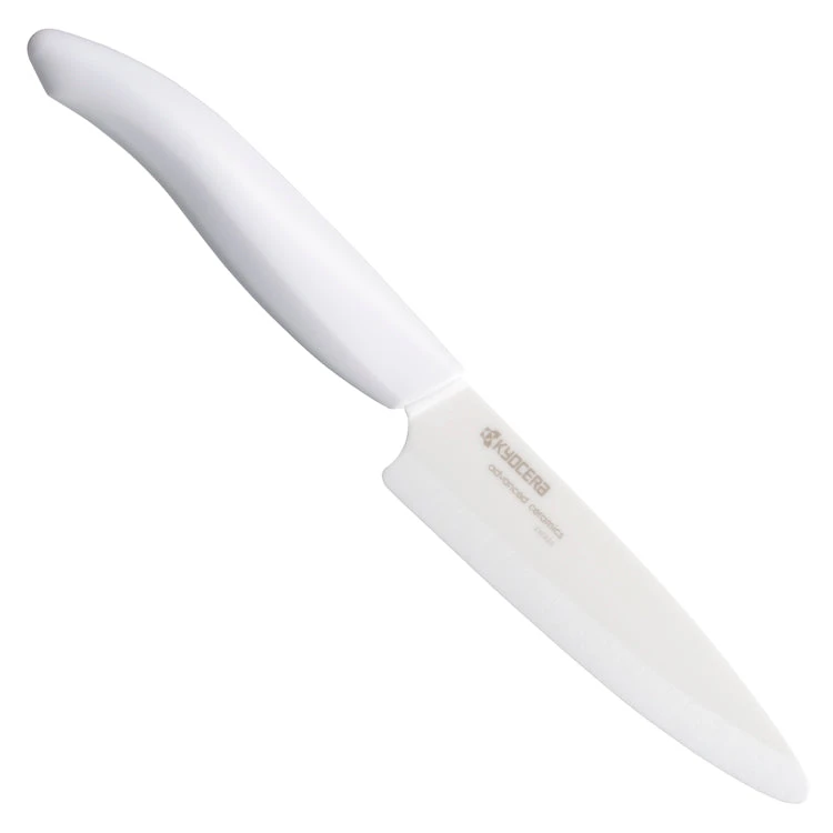The Kyocera Revolution Series Ceramic 4.5″ Utility Knife features a razor-sharp, exceptionally strong, lightweight ceramic blade. This ceramic blade, made from Kyocera’s proprietary Japanese ceramic, zirconium oxide, is inert, and will not discolor food or alter its taste. In addition, the blade will never rust, corrode or pit. Made of ceramic that is ground very fine and highly polished, it will retain its sharpness at least 10 times longer than any other blade – including one made from high carbon steel.