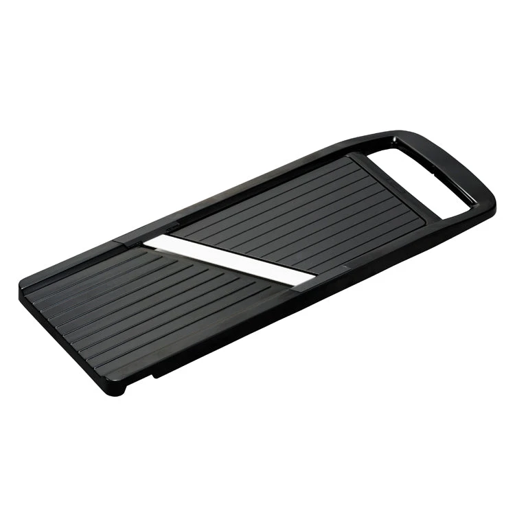 This mandoline quickly, easily and uniformly slices vegetables such as cabbage, carrots, cucumbers, onions, potatoes and more for uniform cooking and beautiful presentation. Its extra wide surface easily accomodates larger foods such as lettuce and cabbage. Foods glide smoothly across the sharp, angled blade. The notch at the bottom of the mandoline hook over the edges of most bowls for stability, and the ergonomic handle is comfortable to hold.