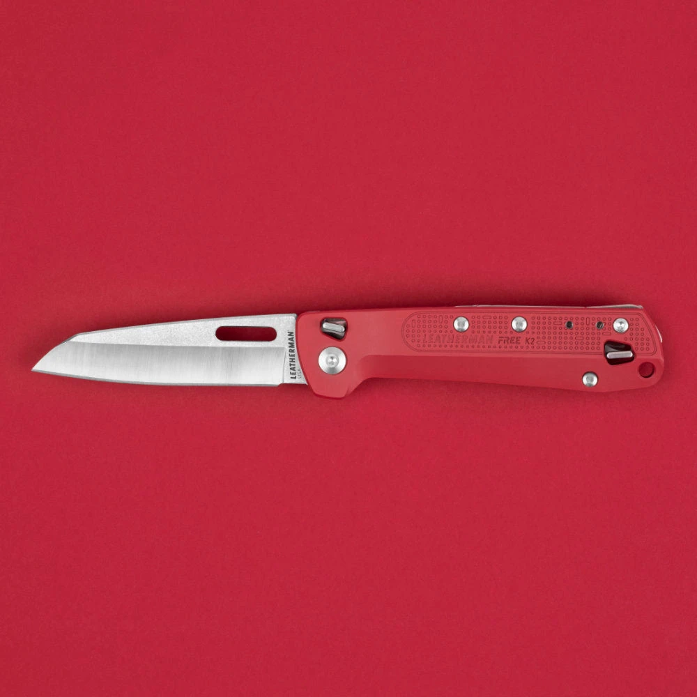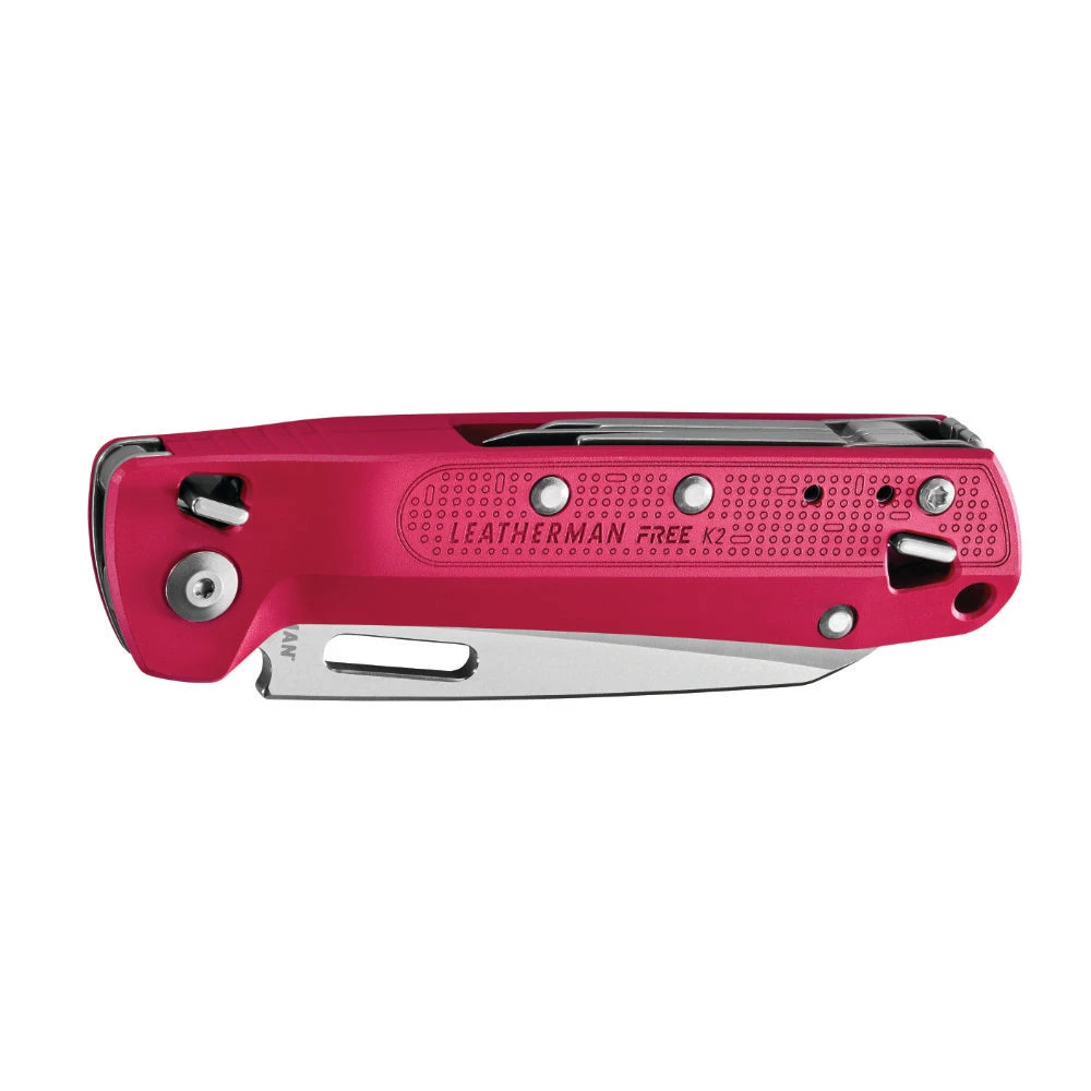 The Leatherman FREE K2 Crimson Multipurpose Knife is much more than a simple knife. This innovative multi-tool includes DIY essentials such as a knife blade, an awl, a robust pry tool and more. Each of the 8 tools built into this multi-tasker open smoothly with one hand, lock in the open position while in use, and snap back into place when the job is done.