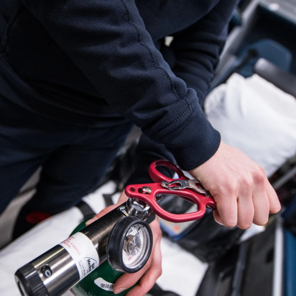 An oxygen tank wrench allows access to life-saving oxygen, even when an oxygen bottle’s wrench isn’t easily at hand. Integrated into the strap cutter, this oxygen tank wrench is available when needed, but doesn’t get in the way.