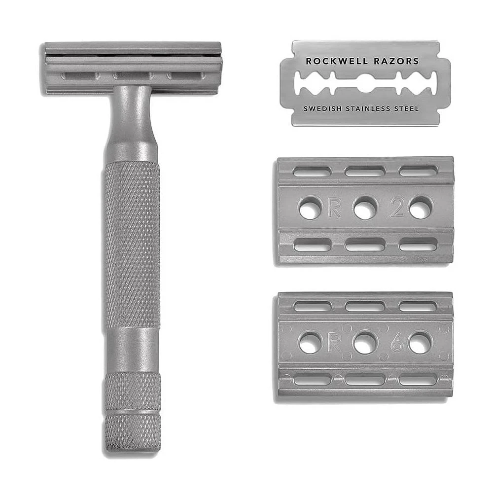 1 Rockwell 6S Double Edge Razor, 3 Patented Flippable Base Plats for 6 Levels of Adjustability, and 5 Rockwell Swedish Stainless Steel Razor Blades